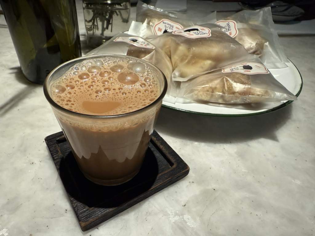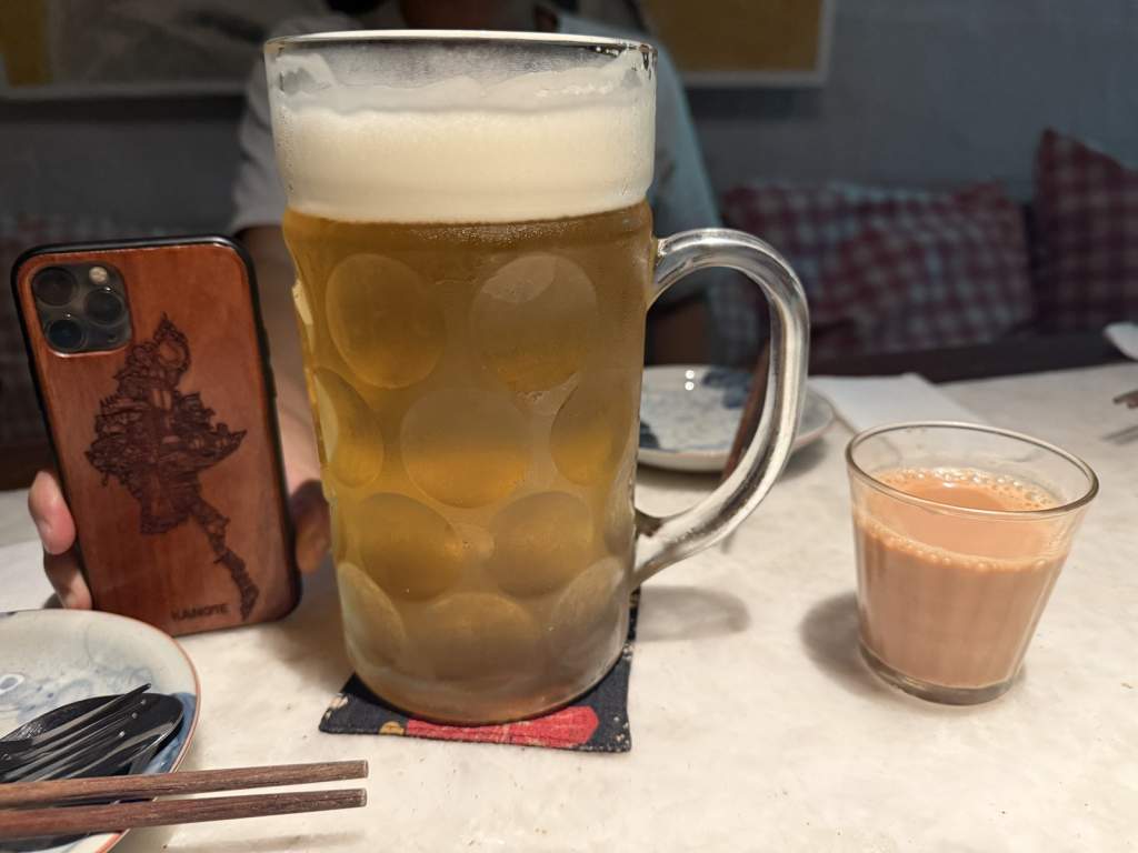 最後,飲品的組合讓這場體驗有了完美的收尾,桌面更添熱鬧。一杯濃郁的奶茶溫潤滑順,另一邊冰涼啤酒的氣泡正不斷上升,兩者一冷一熱,剛好對應著我們這群人的心情。有人選擇茶香的安穩,有人偏愛酒精的爽快,而這樣的差異正好構成了午後最好的平衡。