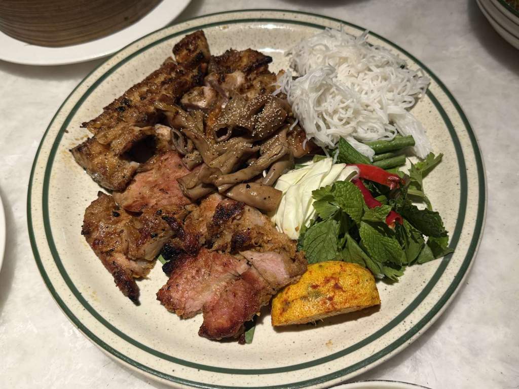 餐桌上的料理一一登場。最吸引目光的是那份色彩繽紛的拼盤,烤得微焦的肉片外酥內嫩,搭配新鮮蔬菜與米線,酸辣醬汁帶來豐富層次,馬上打開了大家的食慾。幾個人一邊分食,一邊聊起各自的近況,餐桌頓時充滿笑聲。