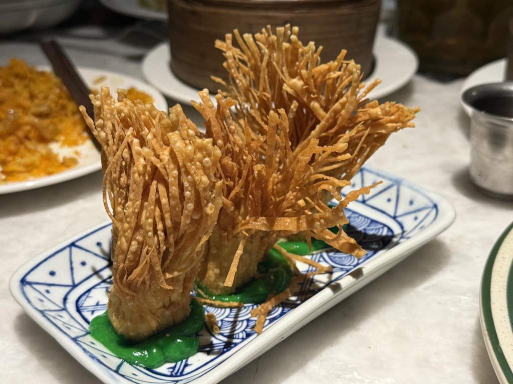 桌上的兩款酥脆小點也各有巧思。當然少不了酥脆的小點!炸條外層酥香,咬下去輕盈鬆脆;另一款細絲炸物則像金色花束般盛放,入口時發出脆響,瞬間讓談話中斷,大家同時發出滿足的笑聲。