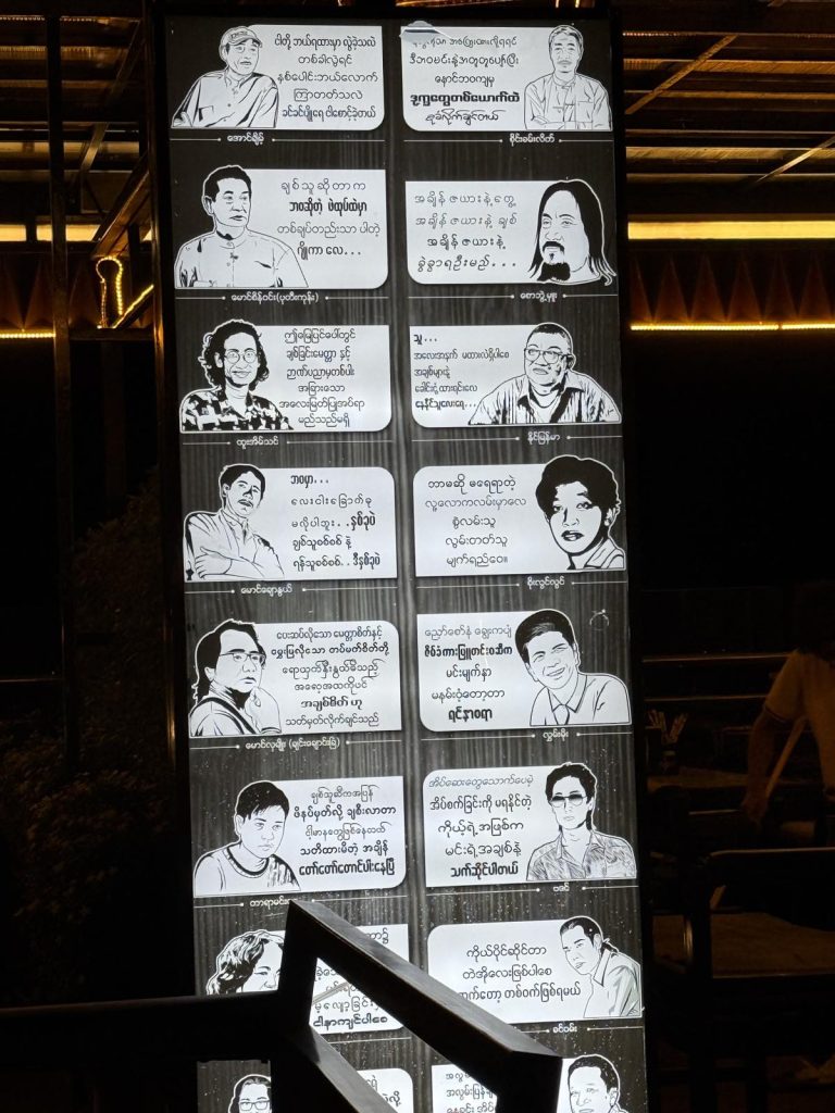 最吸睛的,是場地中央那根被燈光照亮的長柱,上面印著緬甸文化界人物的插畫與語錄——詩人、作家、音樂人、藝術家。每個故事都在提醒你:曼德勒從來不是只有皇宮與古蹟,它也是緬甸文化的心臟。很多當地創作者、樂手、表演者,就是在這樣的城市土壤裡長大的。