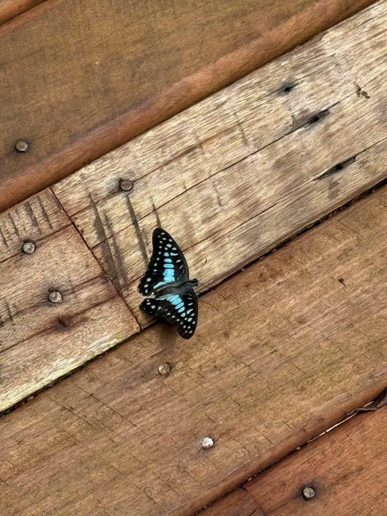 在花園裡走走看看時,木地板上偶爾會停著一兩隻蝴蝶,翅膀是亮眼的藍綠色,跟深色木紋形成很漂亮的對比。那一刻,我突然覺得這間屋子有點像那些木化石——外表看起來已經變成了石頭,但裡面仍然保留著曾經是「木頭」的痕跡。