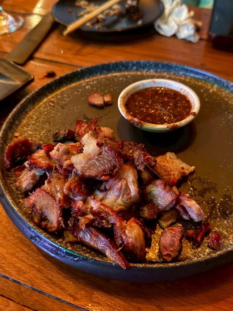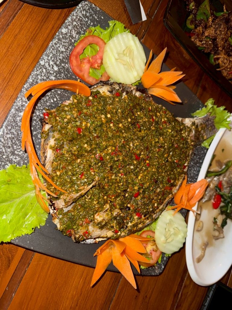 豬肉外層焦脆、內裡多汁,搭配酸辣沾醬,辣勁在口中逐漸蔓延;烤魚鋪上滿滿的香草與辣椒,看似張揚,卻意外平衡。