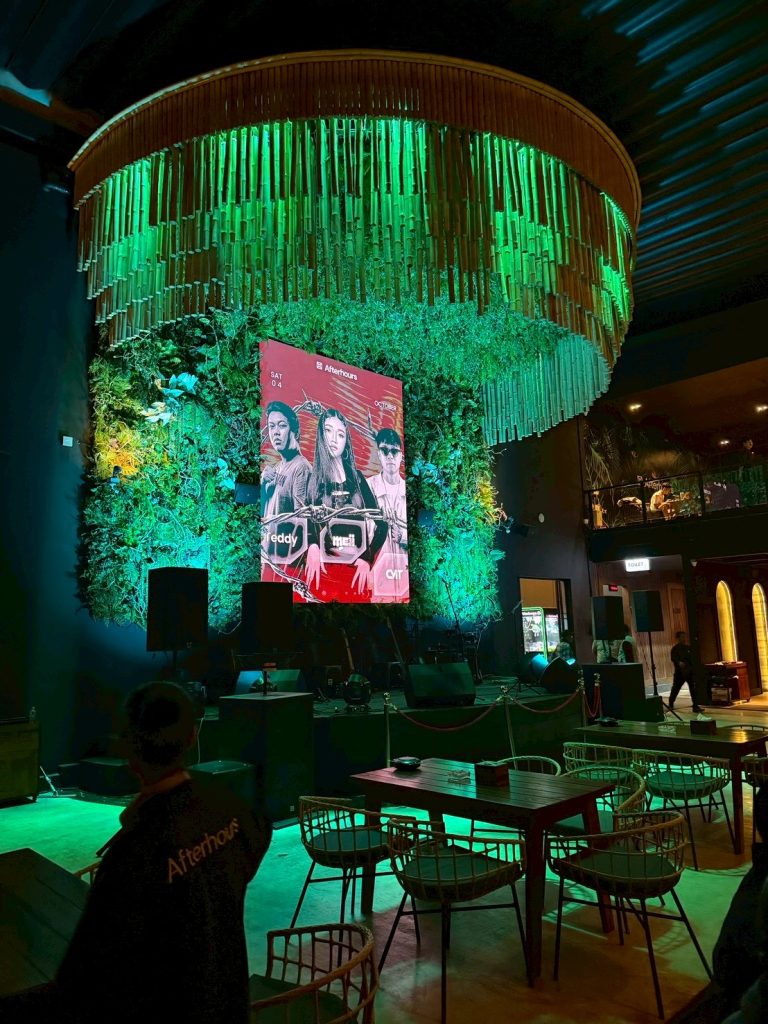 走進 Afterhours,第一眼就被那面巨大的植栽牆吸引,竹條、乾燥花與光影交錯,構成一種原始與現代並存的視覺語言。
